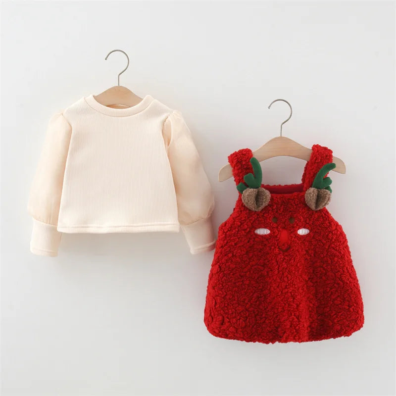 Composé d'une adorable robe rouge à bretelles en peluche douce et d'un t-shirt blanc à manches longues en coton, il offre à la fois chaleur et liberté de mouvement.